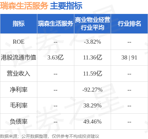 瑞森生活服务港股市值3.63亿港元,在商业物业经营行业中排名第38。主要指标见下表: