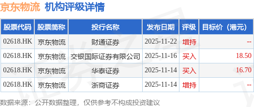 投行对该股的评级以增持为主,近90天内共有2家投行给出增持评级,近90天的目标均价为17.6港元。财通证券最新一份研报给予京东物流增持评级。