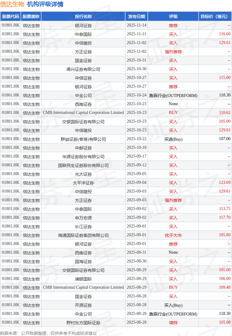 投行对该股的评级以买入为主,近90天内共有20家投行给出买入评级,近90天的目标均价为114.79港元。银河证券最新一份研报给予信达生物推荐评级。