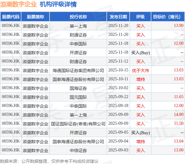 投行对该股的评级以买入为主,近90天内共有10家投行给出买入评级,近90天的目标均价为12.79港元。第一上海最新一份研报给予浪潮数字企业买入评级,目标价13.9港元。
