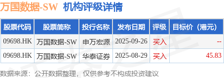 投行对该股的评级以买入为主,近90天内共有2家投行给出买入评级,近90天的目标均价为45.83港元。申万宏源最新一份研报给予万国数据-SW买入评级。