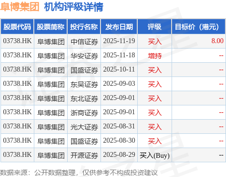 投行对该股的评级以买入为主,近90天内共有7家投行给出买入评级,近90天的目标均价为8港元。中信证券最新一份研报给予阜博集团买入评级,目标价8港元。