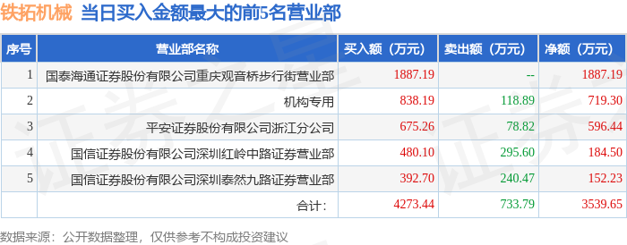 证券之星消息,沪深交易所2025年11月24日公布的交易公开信息显示,铁拓机械(920706)因当日换手率达到20%的前5只股票登上龙虎榜。此次是近5个交易日内第1次上榜。
