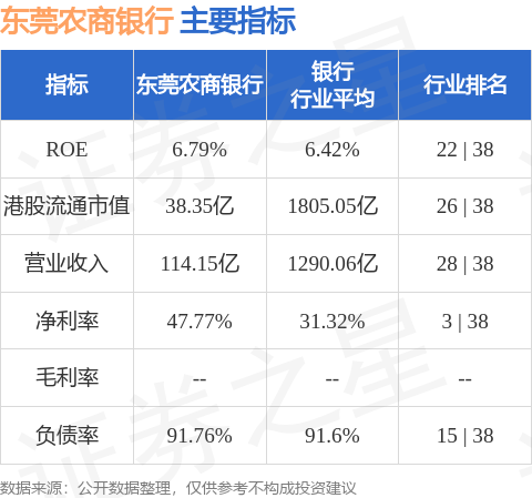 东莞农商银行港股市值38.35亿港元,在银行行业中排名第26。主要指标见下表: