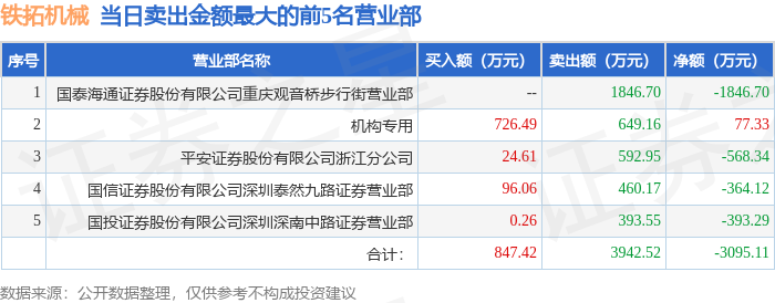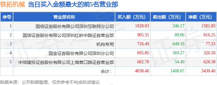 证券之星消息,沪深交易所2025年11月25日公布的交易公开信息显示,铁拓机械(920706)因当日换手率达到20%的前5只股票登上龙虎榜。此次是近5个交易日内第2次上榜。