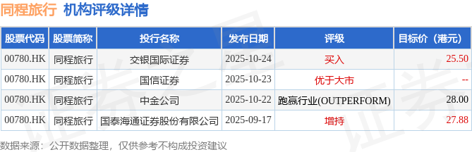 投行对该股的评级以跑赢行业(OUTPERFORM)为主,近90天内共有1家投行给出跑赢行业(OUTPERFORM)评级,近90天的目标均价为27.13港元。交银国际证券最新一份研报给予同程旅行买入评级,目标价25.5港元。