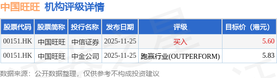 投行对该股的评级以跑赢行业(OUTPERFORM)为主,近90天内共有1家投行给出跑赢行业(OUTPERFORM)评级,近90天的目标均价为5.72港元。中信证券最新一份研报给予中国旺旺买入评级,目标价5.6港元。