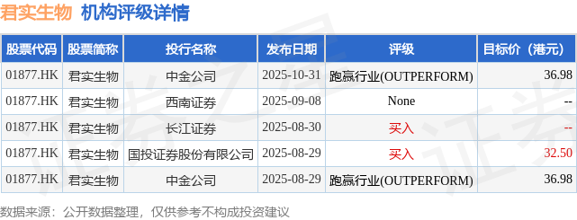 投行对该股的评级以跑赢行业(OUTPERFORM)为主,近90天内共有2家投行给出跑赢行业(OUTPERFORM)评级,近90天的目标均价为35.49港元。中金公司最新一份研报给予君实生物跑赢行业(OUTPERFORM)评级,目标价36.98港元。
