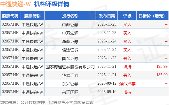 投行对该股的评级以买入为主,近90天内共有6家投行给出买入评级,近90天的目标均价为190.94港元。中邮证券最新一份研报给予中通快递-W买入评级。