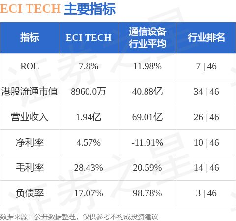 ECI TECH港股市值8960万港元,在通信设备行业中排名第34。主要指标见下表: