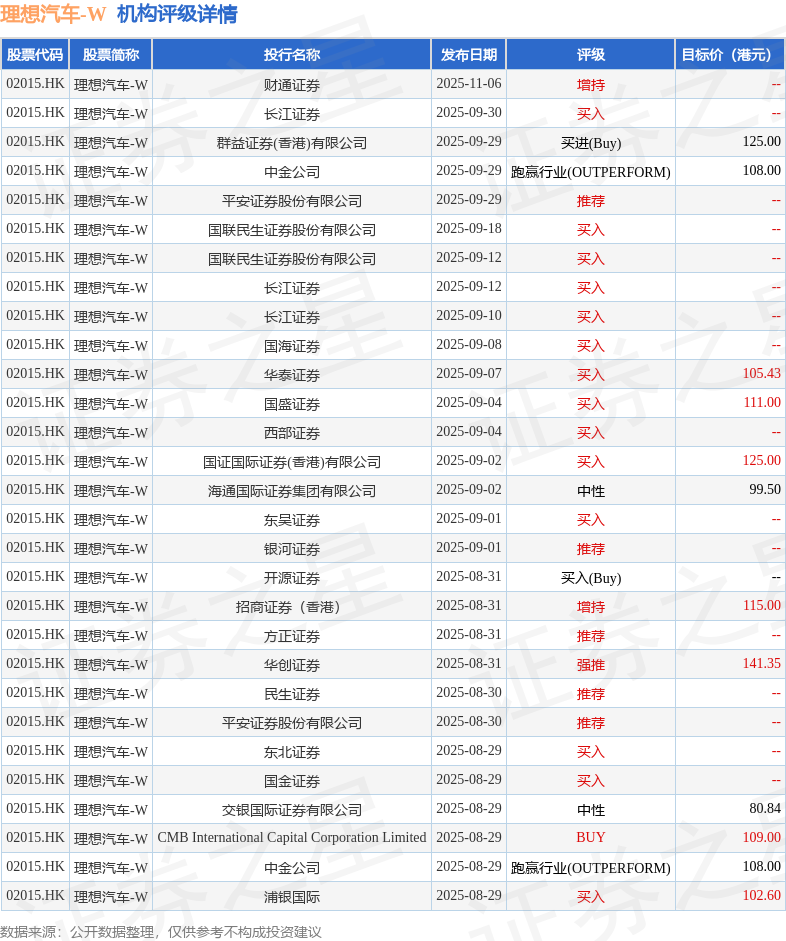 投行对该股的评级以买入为主,近90天内共有14家投行给出买入评级,近90天的目标均价为107.19港元。中金公司最新一份研报给予理想汽车-W跑赢行业(OUTPERFORM)评级,目标价100港元。