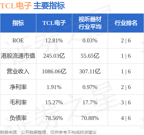 TCL电子港股市值245.03亿港元,在视听器材行业中排名第1。主要指标见下表: