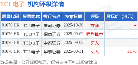 投行对该股的评级以买入为主,近90天内共有2家投行给出买入评级,近90天的目标均价为11.7港元。银河证券最新一份研报给予TCL电子推荐评级。