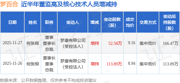 证券之星消息,根据11月27日市场公开信息、上市公司公告及交易所披露数据整理,梦百合(603313)最新董监高及相关人员股份变动情况:2025年11月27日公司董事,董事长,总裁倪张根共增持公司股份52.58万股,占公司总股本为0.0922%。变动期间公司股价上涨2.58%,11月27日当日收盘报9.16元。