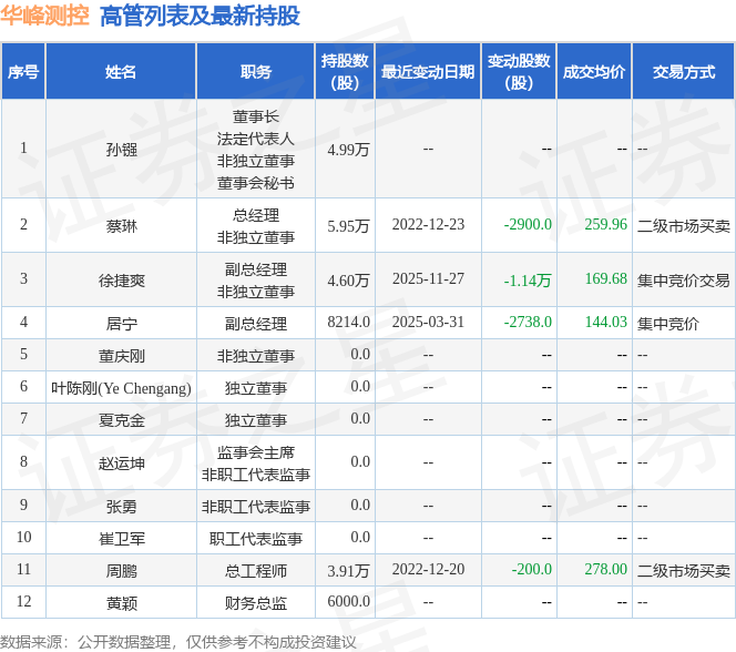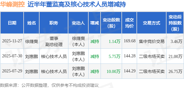华峰测控近半年内的董监高及核心技术人员增减持详情如下: