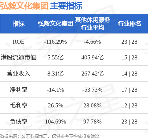 弘毅文化集团港股市值5.55亿港元,在其他休闲服务行业中排名第15。主要指标见下表: