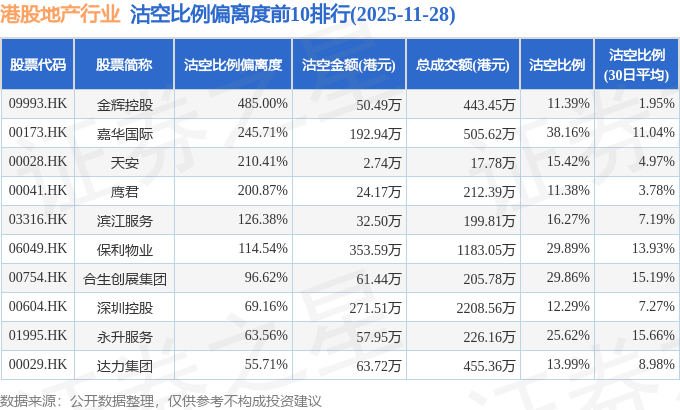 从沽空比例偏离度来看,金辉控股、嘉华国际、天安沽空比例偏离度位居行业前三,分别为485%、245.71%、210.41%。