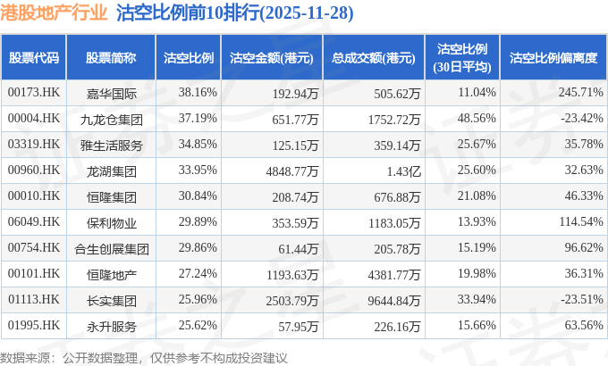 从沽空比例来看,嘉华国际、九龙仓集团、雅生活服务沽空比例位居行业前三,分别为38.16%、37.19%、34.85%。