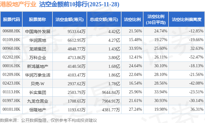 从沽空金额来看,中国海外发展、华润置地、龙湖集团沽空金额位居行业前三,分别为9533.64万港元、6612.95万港元、4848.77万港元。
