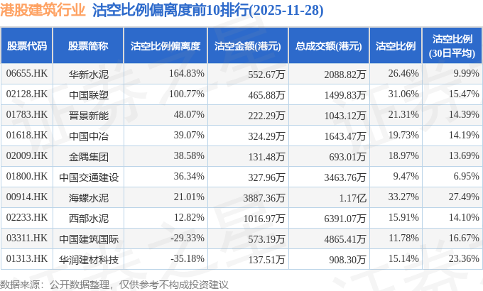 从沽空比例偏离度来看,华新水泥、中国联塑、晋景新能沽空比例偏离度位居行业前三,分别为164.83%、100.77%、48.07%。