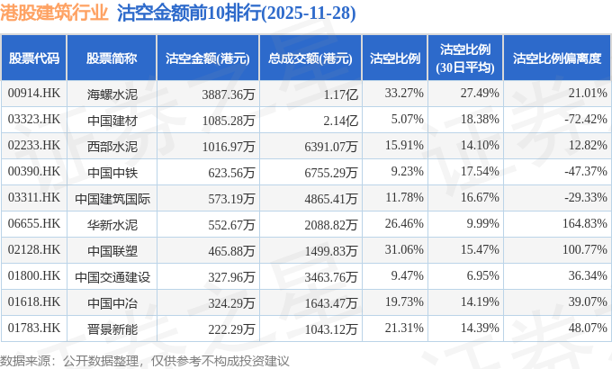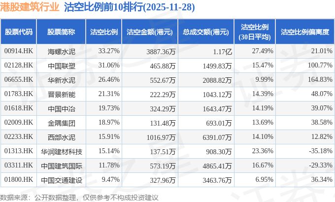 从沽空比例来看,海螺水泥、中国联塑、华新水泥沽空比例位居行业前三,分别为33.27%、31.06%、26.46%。
