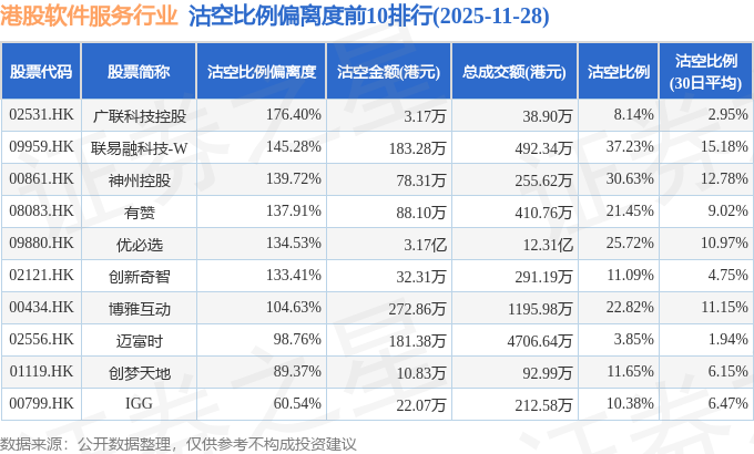 从沽空比例偏离度来看,广联科技控股、联易融科技-W、神州控股沽空比例偏离度位居行业前三,分别为176.4%、145.28%、139.72%。