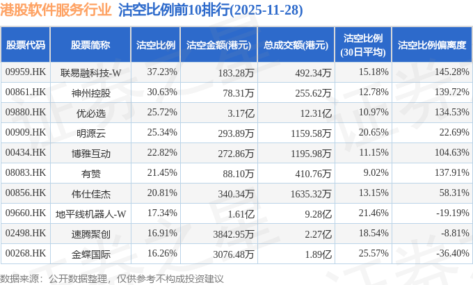 从沽空比例来看,联易融科技-W、神州控股、优必选沽空比例位居行业前三,分别为37.23%、30.63%、25.72%。