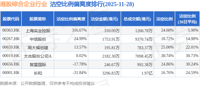 从沽空比例偏离度来看,上海实业控股、中信股份、周大福创建沽空比例偏离度位居行业前三,分别为316.67%、24.99%、13.57%。