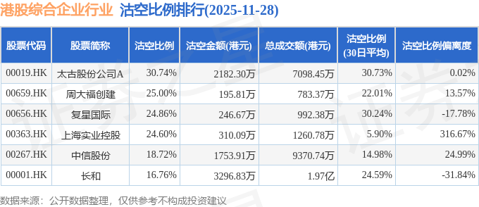 从沽空比例来看,太古股份公司A、周大福创建、复星国际沽空比例位居行业前三,分别为30.74%、25%、24.86%。