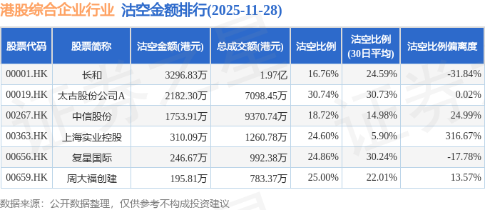 从沽空金额来看,长和、太古股份公司A、中信股份沽空金额位居行业前三,分别为3296.83万港元、2182.3万港元、1753.91万港元。