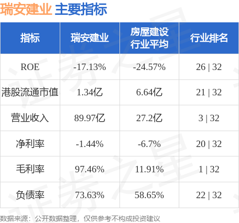瑞安建业港股市值1.34亿港元,在房屋建设行业中排名第21。主要指标见下表: