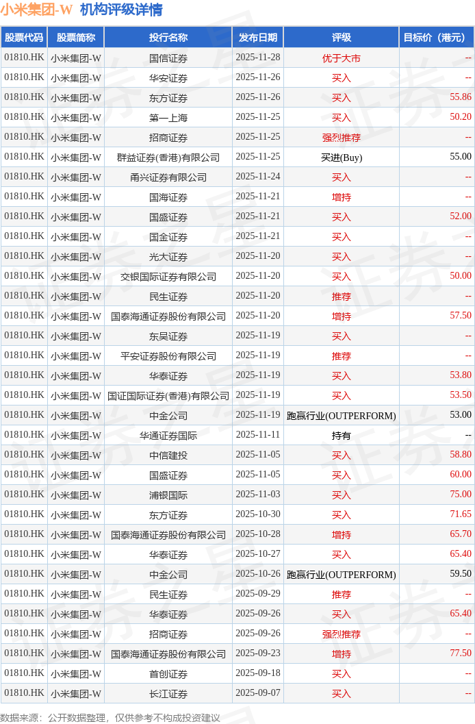 截至2025年11月28日收盘,小米集团-W(01810.HK)报收于41.02港元,下跌0.19%,成交量8561.44万股,成交额35.07亿港元。投行对该股的评级以买入为主,近90天内共有19家投行给出买入评级,近90天的目标均价为59.99港元。国信证券最新一份研报给予小米集团-W优于大市评级。