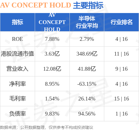 AV CONCEPT HOLD港股市值3.63亿港元,在半导体行业中排名第11。主要指标见下表: