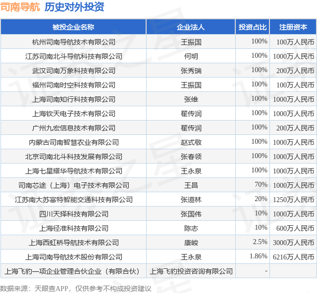 证券之星消息,根据天眼查APP显示,司南导航(688592.SH)新增一起对外投资事件,被投资公司为杭州司南导航技术有限公司,法定代表人王振国,投资占比为100%。该公司从事专业技术服务业,注册资本为100万人民币。目前,司南导航共存在对外投资17项,详见下表: