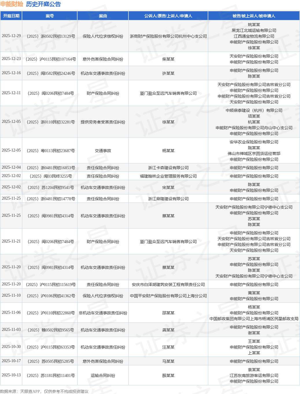 案号:(2025)浙0481民初16853号根据统计,近一年内以申能财产保险股份有限公司为当事人的历史开庭公告有75则,其中案由为“机动车交通事故责任纠纷”的公告以42则居首,其次为“责任保险合同纠纷”有9则,“财产保险合同纠纷”有5则。历史开庭公告(前20条)如下: