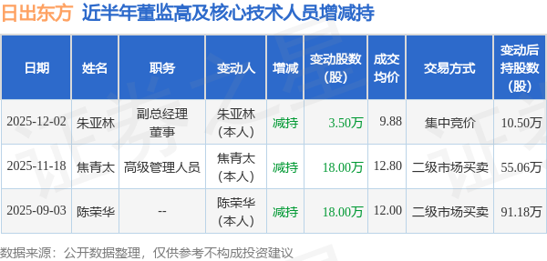日出东方近半年内的董监高及核心技术人员增减持详情如下: