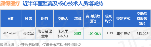 证券之星消息,根据12月2日市场公开信息、上市公司公告及交易所披露数据整理,鹿得医疗(920278)最新董监高及相关人员股份变动情况:2025年12月1日公司副总经理,董事朱文军共减持公司股份100.0万股,占公司总股本为0.5731%。变动期间公司股价上涨1.77%,12月1日当日收盘报9.22元。