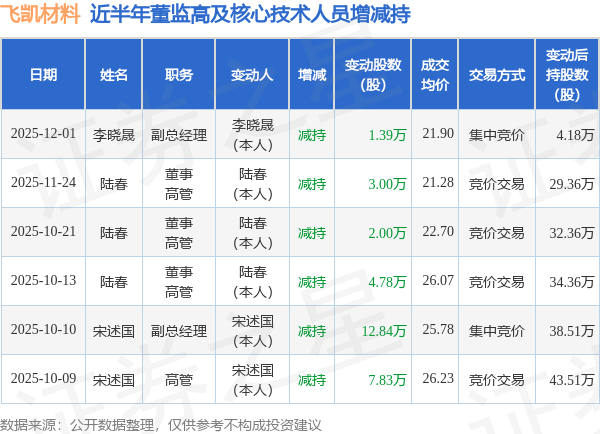 飞凯材料近半年内的董监高及核心技术人员增减持详情如下: