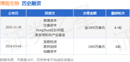证券之星消息,根据天眼查APP于11月30日公布的信息整理,博致生物科技(上海)有限公司A+轮融资,融资额逾3000万美元,参与投资的机构包括奥博资本,汉康资本,HongShan红杉中国,某全球知名产业基金。