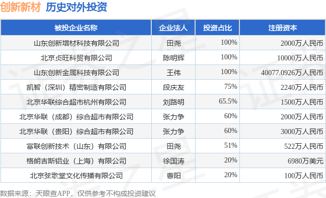 证券之星消息,根据天眼查APP显示,创新新材(600361.SH)新增一起对外投资事件,被投资公司为凯智(深圳)精密制造有限公司,法定代表人段庆友,投资占比为75%。该公司从事专用设备制造业,注册资本为2240万人民币。目前,创新新材共存在对外投资10项,详见下表: