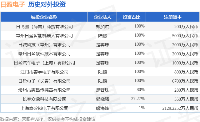 证券之星消息,根据天眼查APP显示,日盈电子(603286.SH)新增一起对外投资事件,被投资公司为日飞鹏(海南)商贸有限公司,法定代表人郑加洪,投资占比为100%。该公司从事批发业,注册资本为200万人民币。目前,日盈电子共存在对外投资10项,详见下表: