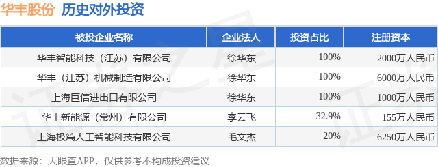 证券之星消息,根据天眼查APP显示,华丰股份(605100.SH)新增一起对外投资事件,被投资公司为上海极篇人工智能科技有限公司,法定代表人毛文杰,投资占比为20%。该公司从事软件和信息技术服务业,注册资本为6250万人民币。目前,华丰股份共存在对外投资5项,详见下表: