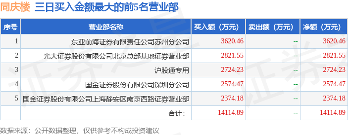 证券之星消息,沪深交易所2025年12月3日公布的交易公开信息显示,同庆楼(605108)因有价格涨跌幅限制的日价格振幅达到15%的前五只证券,非ST、*ST和S证券连续三个交易日内收盘价格涨幅偏离值累计达到20%的证券登上龙虎榜。此次是近5个交易日内第1次上榜。