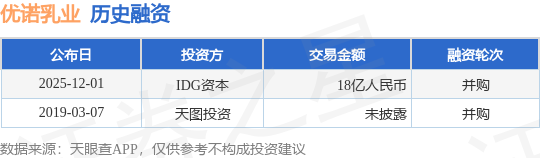 证券之星消息,根据天眼查APP于12月1日公布的信息整理,优诺乳业有限公司并购融资,融资额18亿人民币,参与投资的机构包括IDG资本。