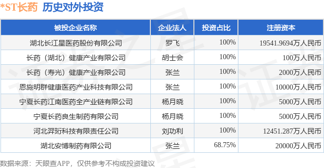 证券之星消息,根据天眼查APP显示,*ST长药(300391.SZ)新增一起对外投资事件,被投资公司为湖北长江星医药股份有限公司,法定代表人罗飞,投资占比为100%。该公司从事医药制造业,注册资本为19541.9694万人民币。目前,*ST长药共存在对外投资8项,详见下表: