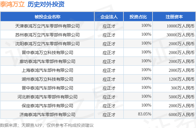 证券之星消息,根据天眼查APP显示,泰鸿万立(603210.SH)新增一起对外投资事件,被投资公司为天津泰鸿万立汽车零部件有限公司,法定代表人应正才,投资占比为100%。该公司从事汽车制造业,注册资本为10000万人民币。目前,泰鸿万立共存在对外投资11项,详见下表: