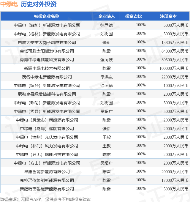 证券之星消息,根据天眼查APP显示,中绿电(000537.SZ)新增一起对外投资事件,被投资公司为新疆哈密广恒新能源有限公司,法定代表人陈雷,投资占比为78%。该公司从事电力、热力生产和供应业,注册资本为9000万人民币。目前,中绿电共存在对外投资32项,投资占比前20的项目见下表: