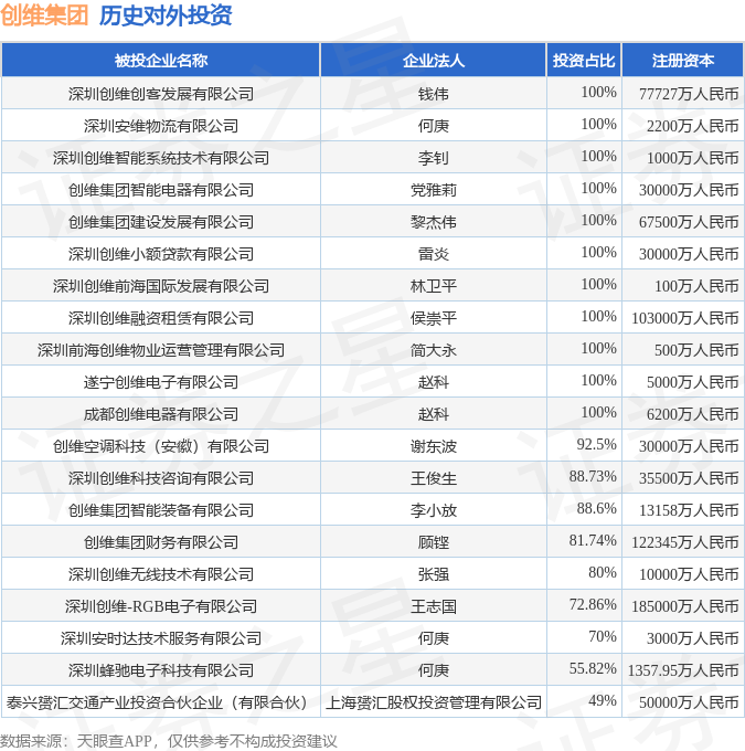 证券之星消息,根据天眼查APP显示,创维集团(00751.HK)新增一起对外投资事件,被投资公司为深圳蜂驰电子科技有限公司,法定代表人何庚,投资占比为55.82%。该公司从事机动车、电子产品和日用产品修理业,注册资本为1357.95万人民币。目前,创维集团共存在对外投资31项,投资占比前20的项目见下表: