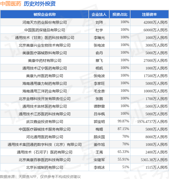 证券之星消息,根据天眼查APP显示,中国医药(600056.SH)新增一起对外投资事件,被投资公司为河南天方药业股份有限公司,法定代表人刘玮,投资占比为100%。该公司从事医药制造业,注册资本为42000万人民币。目前,中国医药共存在对外投资27项,投资占比前20的项目见下表: