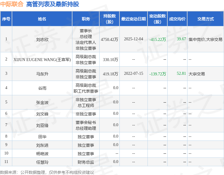 中际联合的高管列表及最新持股情况如下: